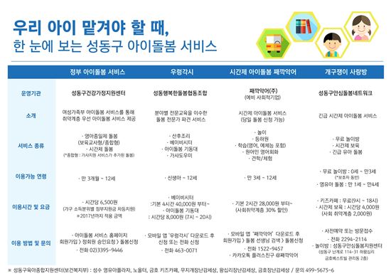 [아시아경제 박종일 기자] 성동구(구청장 정원오)는 긴급· 긴요한 순간에 아이돌봄 서비스가 필요한 가정에 맞춤형 돌봄 정보를 제공하기 위해 '한 눈에 보는 성동 아이돌봄 가이드'를 제작?배포한다.