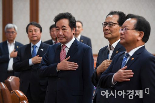 이낙연 국무총리가 10일 오전 서울 종로구 정부서울청사에서 열린 국무회의에 참석해 국민의례 하고 있다.