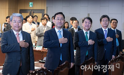 [아시아경제 윤동주 기자] 김동철 국민의당 원내대표(왼쪽부터), 주호영 바른정당 대표대행, 안철수 국민의당 대표, 유승민 바른정당 의원이 10일 국회에서 열린 국민의당과 바른정당 정책연구원 주최 '선거제도 개편의 바람직한 방향' 토론회에 참석, 국민의례를 하고 있다.
