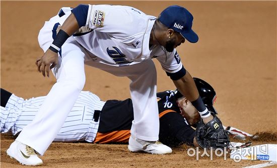 [창원=아시아경제 김현민 기자]프로야구 롯데 자이언츠와 NC 다이노스이 2017 KBO리그 준플레이오프 3차전이 11일 창원 마산야구장에서 열렸다. 1회초 무사 1루에서 NC 1루수 스크럭스가 투수 견제에 걸린 롯데 1루주자 전준우를 태그아웃시키고 있다.