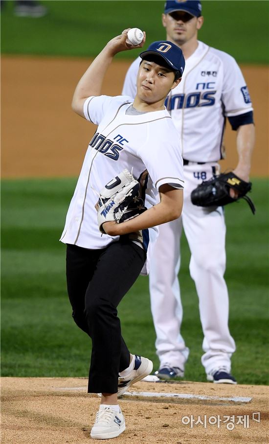 [창원=아시아경제 김현민 기자]프로야구 롯데 자이언츠와 NC 다이노스이 2017 KBO리그 준플레이오프 3차전이 11일 창원 마산야구장에서 열렸다. 마산 용마고 투수 노시훈이 시구하고 있다.