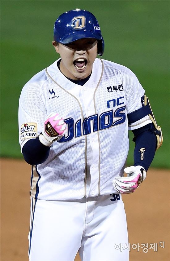 [창원=아시아경제 김현민 기자]프로야구 롯데 자이언츠와 NC 다이노스이 2017 KBO리그 준플레이오프 3차전이 11일 창원 마산야구장에서 열렸다. 1회말 2사 1,2루에서 NC 권희동이 추가 1타점 적시타를 치고 환호하고 있다.