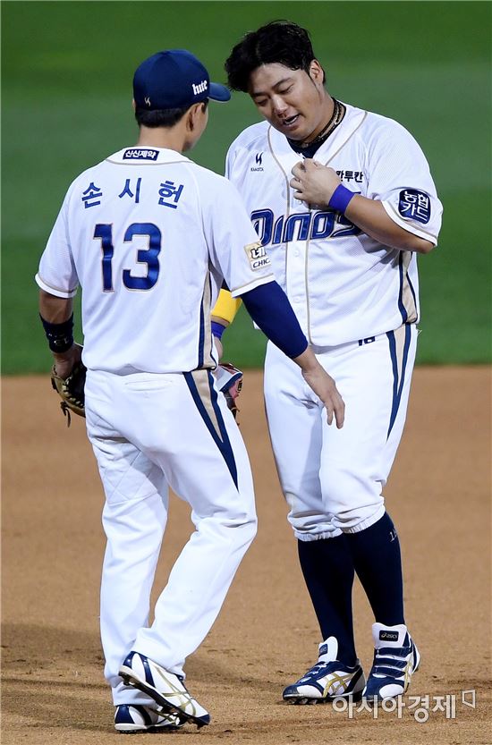 [창원=아시아경제 김현민 기자]프로야구 롯데 자이언츠와 NC 다이노스이 2017 KBO리그 준플레이오프 3차전이 11일 창원 마산야구장에서 열렸다. 2회초 2사 1,2루에서 NC 3루수 박석민이 롯데 문규현의 타구를 놓쳐 실책한 뒤 아쉬워하고 있다.