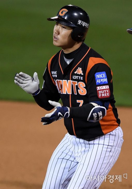 [창원=아시아경제 김현민 기자]프로야구 롯데 자이언츠와 NC 다이노스이 2017 KBO리그 준플레이오프 3차전이 11일 창원 마산야구장에서 열렸다. 2회초 2사 만루에서 롯데 신본기가 1타점 적시타를 치고 박수치며 기뻐하고 있다.