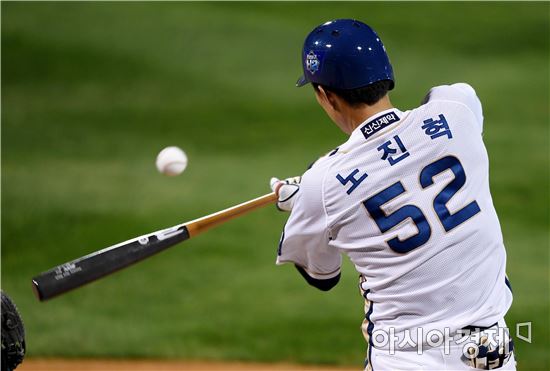 [창원=아시아경제 김현민 기자]프로야구 롯데 자이언츠와 NC 다이노스이 2017 KBO리그 준플레이오프 3차전이 11일 창원 마산야구장에서 열렸다. 3회말 2사 2루에서 NC 노진혁이 롯데 선발 송승준을 상대로 추가 투런 홈런을 치고 있다.