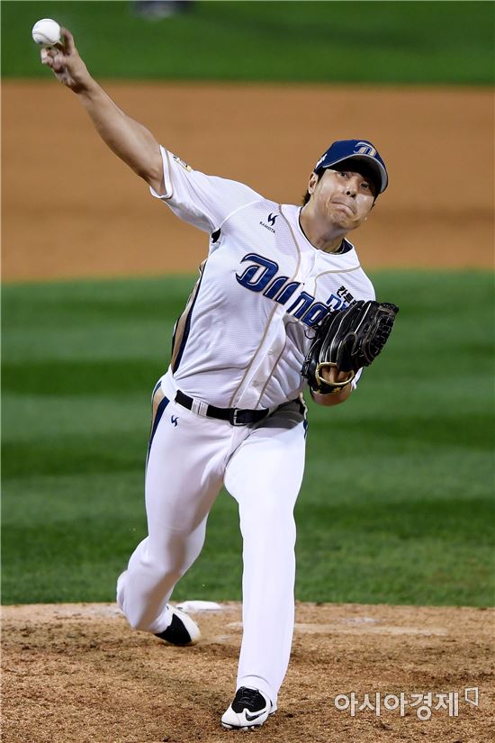 [창원=아시아경제 김현민 기자]프로야구 롯데 자이언츠와 NC 다이노스이 2017 KBO리그 준플레이오프 3차전이 11일 창원 마산야구장에서 열렸다. 5회초 NC 구원투수 김진성이 역투하고 있다.
