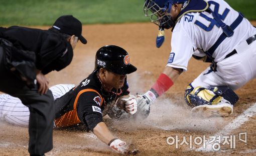 [창원=아시아경제 김현민 기자]프로야구 롯데 자이언츠와 NC 다이노스이 2017 KBO리그 준플레이오프 3차전이 11일 창원 마산야구장에서 열렸다. 6회초 1사 만루에서 롯데 박헌도의 우익수 뜬공 때 태그업을 시도한 3루주자 전준우가 NC 김태군 포수에게 태그아웃되고 있다.