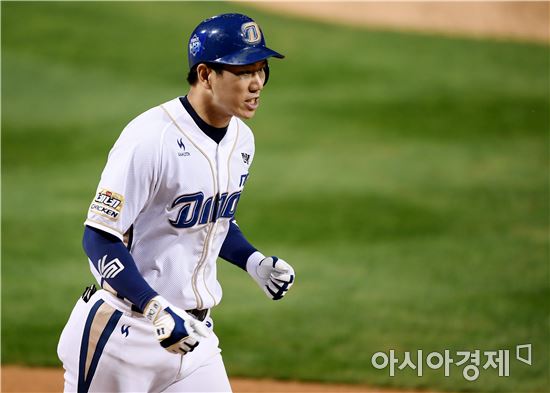 [창원=아시아경제 김현민 기자]프로야구 롯데 자이언츠와 NC 다이노스이 2017 KBO리그 준플레이오프 3차전이 11일 창원 마산야구장에서 열렸다. 6회말 1사에서 NC 모창민이 롯데 장시환을 상대로 추가 솔로 홈런을 치고 기뻐하고 있다.