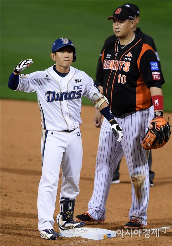 [창원=아시아경제 김현민 기자]프로야구 롯데 자이언츠와 NC 다이노스이 2017 KBO리그 준플레이오프 3차전이 11일 창원 마산야구장에서 열렸다. 6회말 2사 1,2루에서 NC 손시헌이 추가 1타점 적시타를 치고 기뻐하고 있다.