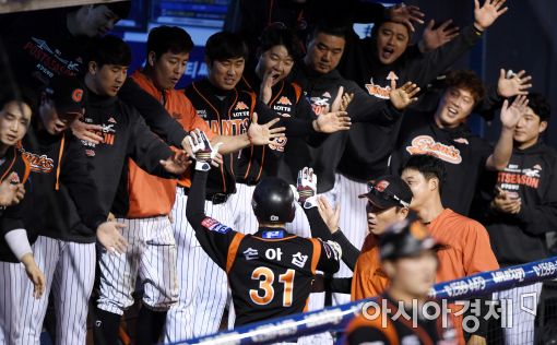 [창원=아시아경제 김현민 기자]프로야구 롯데 자이언츠와 NC 다이노스이 2017 KBO리그 준플레이오프 3차전이 11일 창원 마산야구장에서 열렸다. 8회초 1사 1루에서 롯데 손아섭이 NC 임정호를 상대로 투런 홈런을 치고 동료들과 기뻐하고 있다.