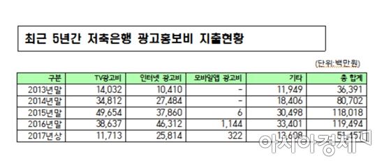2013년 363억원이던 저축은행 광고비는 2014년 807억원으로 급증했으며, 2015년에 1000억원을 넘어섰다. 올해 상반기에만 514억원을 지출했다.