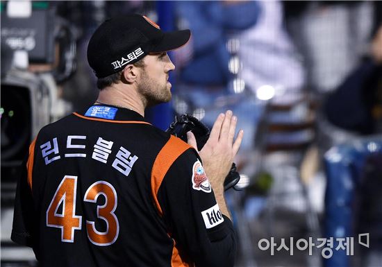 [창원=아시아경제 김현민 기자]프로야구 롯데 자이언츠와 NC 다이노스의 2017 KBO리그 준플레이오프 4차전이 13일 창원 마산야구장에서 열렸다. 롯데 선발투수 린드블럼이 8회말 2사 3루에서 NC 나성범을 우익수 뜬공으로 처리한 뒤 박수치고 있다.