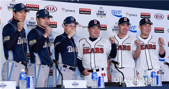 [잠실=아시아경제 김현민 기자]프로야구 NC 다이노스와 두산 베어스의 2017 KBO리그 플레이오프 미디어데이가 16일 서울 잠실야구장에서 열렸다. 양팀 선수단이 파이팅을 외치며 선전을 다짐하고 있다. 모창민, 임창민, 김경문 감독(이상 NC, 왼쪽부터), 김태형 감독, 유희관, 양의지(이상 두산).