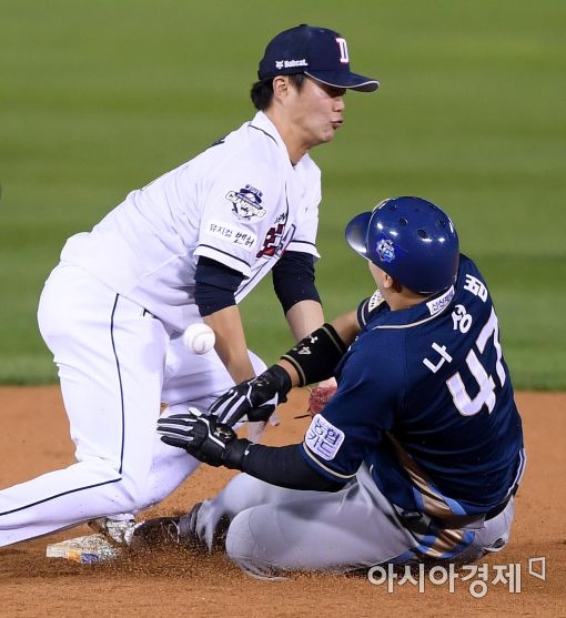 [잠실=아시아경제 김현민 기자]프로야구 NC 다이노스와 두산 베어스의 2017 KBO리그 플레이오프 1차전이 17일 서울 잠실야구장에서 열렸다. 5회초 1사 1,2루에서 NC 박민우의 1루 땅볼 때 두산 유격수 류지혁이 송구를 놓치고 있다.