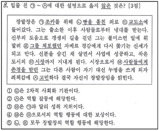 이 문제는 주어진 지문(소설 장발장 발췌)에 대한 설명으로 옳지 않은 것을 고르는 문제였다. 종로학원평가연구소 측은 "선택지 5번은 '㉡,㉣ 모두 장발장의 역할 행동에 해당한다고 한 부분이 틀렸다"며 "㉣은 장발장의 역할행동이 아니라 자베르 경감의 역할행동이기 때문"이라고 설명했다.
