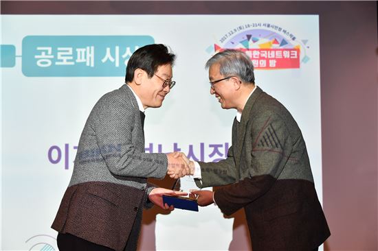 [아시아경제(성남)=이영규 기자] 이재명 성남시장이 '기본소득한국네트워크(BIEN)'로부터 공로패를 수상했다. 기본소득한국네트워크는 국제 기구인 기본소득지구네트워크의 한국 네트워크로 우리나라는 2010년 제13차 BIEN 대회에서 17번째로 가입했다.