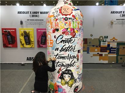 코트라(KOTRA)가 아트협업을 테마로 지난 5일부터 6일까지 2일간 개최한 ‘2017 글로벌 아트 콜라보 엑스포’에 참여한 앱솔루트는 브랜드가 선정한 100명의 가능성 있는 국내 아티스트들과 함께 협업을 진행했다. 약 2m에 달하는 ‘앱솔루트 아이코닉 바틀’ 오브제에 아티스트들의 창조적인 작품 세계를 담는 라이브 릴레이 페인팅을 실시해 현장 방문객들의 이목을 끌었다. 참여 아티스트로는 일러스트 작가 쿤 (KUN), 홍원표, 회화작가 김지희, 신철 등이 있다.