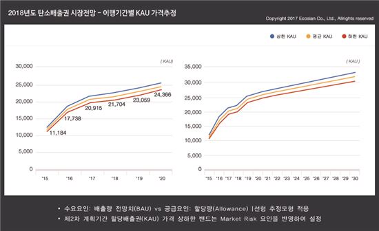 보고서에 따르면 2018년 상반기는 제1차 계획기간이 종료되는 시점으로 탄소배출권의 가격변동성은 확대될 전망이다. 2015~2016년에 걸쳐 배출권이 부족한 업체들은 대부분 차입대응으로 일관한 까닭에 잠재적 매수세는 상당할 것으로 분석했다.