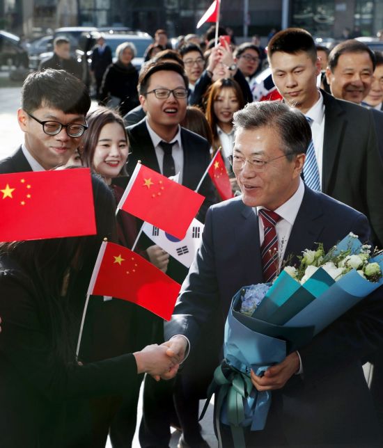 문재인 대통령이 15일 오전 중국 베이징대에 도착해 '한중 청년의 힘찬 악수, 함께 만드는 번영의 미래'를 주제로 연설하기에 앞서 학생들의 환영을 받고 있다. 사진=연합뉴스