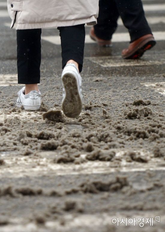 서울에 올겨울 첫 대설주의보가 내린 18일 서울 후암로 인근 한 횡단보도에서 시민들이 질퍽한 눈 위를 걷고 있다. /문호남 기자 munonam@