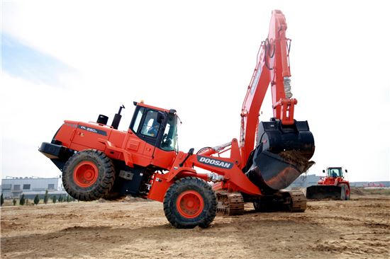17일 두산인프라코어 군산공장에서 굴삭기와 휠로더가 데모쇼를 선보이고 있다.