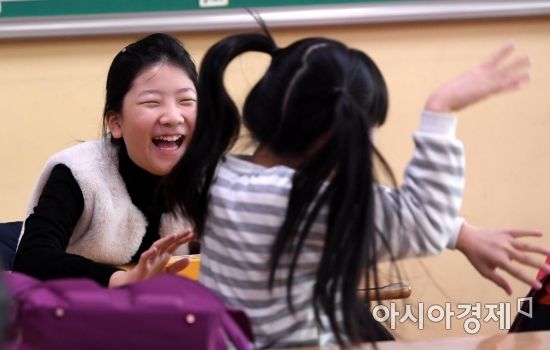 겨울방학을 마치고 24일 개학한 서울 성동구 옥수초등학교 4학년1반 학생들이 장난치며 즐거워하고 있다./김현민 기자 kimhyun81@