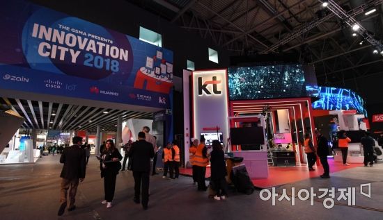 스페인 바르셀로나 피란 그란비아에서 열리는 세계 최대 이동통신박람회 ‘모바일 월드 콩그레스 2018 (Mobile World Congress, MWC)’ 개막을 하루 앞둔 25일(현지시간) KT 관계자들이 관람객 맞을 준비를 하고 있다./사진공동취재단