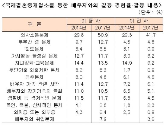 국제결혼중개업체 이용자의 성혼율은 96.3%로 90.2%가 현재 결혼을 지속하고 있었다. 배우자에 대한 만족도는 이용자가 79.8%, 이민자는 88.8%로 나타났고, 결혼생활 만족도는 이용자 73.4%, 이민자 85.6%였다. 또 배우자와의 가장 큰 갈등으로는 이용자의 50.9%, 이민자 41.7%가 의사소통을 문제 삼았다.