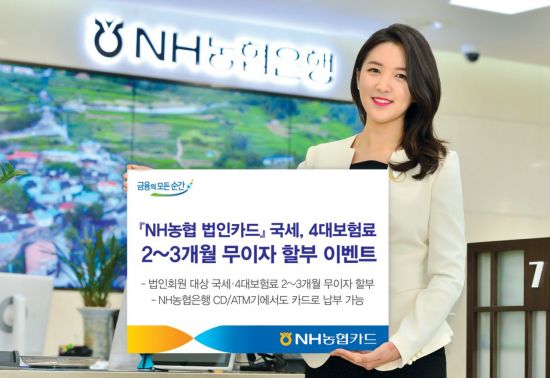 [아시아경제 정현진 기자] NH농협카드가 오는 6월까지 법인카드(개인사업자 포함)로 국세 및 4대 사회보험료 납부 시 2~3개월 무이자할부 이벤트를 실시한다고 9일 밝혔다.