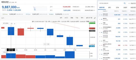9일 가상통화거래소 업비트에 따르면 오후 1시2분 현재 비트코인이 오전 9시 대비 76만2000원(0.72%) 내린 988만7000원에 거래되고 있다. 하루 동안 2490억원어치가 거래됐다.