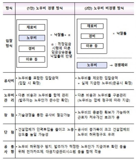 적정임금제 시범사업은 노무비 경쟁방식과 노무비 비경쟁방식의 2가지 방식으로 시행해 성과를 비교·분석할 예정이다. 적정임금 지급에 따른 건설사 부담 완화를 위해 노무비증가분을 공사비에 반영해 추진한다.