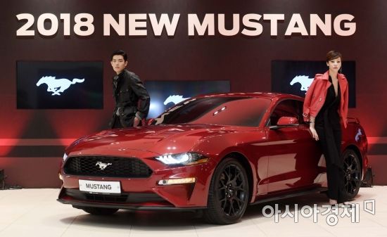 포드코리아가 4일 서울 강남구 대치전시장에서 미디어 쇼케이스를 열고 '2018 뉴 머스탱'을 공식 출시하고 있다. 전면부의 포니 엠블럼으로 잘 알려진 머스탱은 1964년 출시 이후 아메리칸 머슬카의 선두주자로, 50여년간 젊음과 자유를 상징돼 두터운 마니아층을 형성하고 있다./김현민 기자 kimhyun81@