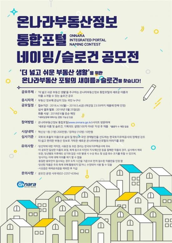 이번 공모전은 대한민국 국민이라면 누구나 자격 제한 없이 참여할 수 있으며, 온나라부동산포털에 접속해 새로운 이름과 슬로건, 참여작에 대한 기획의도를 작성해 제출하면 된다.