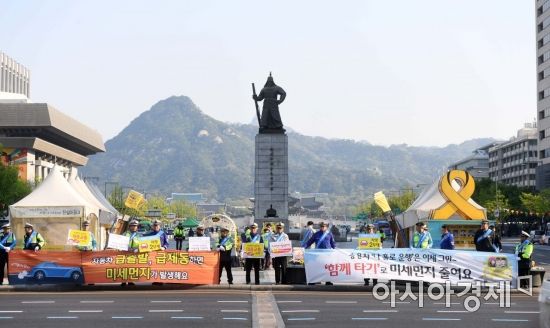 전국 미세먼지 농도가 '좋음'에서 '보통' 수준을 보인 25일 서울 종로구 광화문 네거리에서 미세먼지 줄이기 시민참여 캠페인이 열리고 있다. /문호남 기자 munonam@
