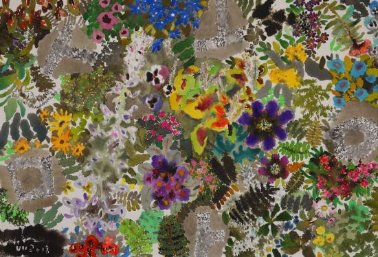 작가는 큰 변화를 시도하는 지금을 10년마다 돌아오는 ‘전환점’이라고 표현했다. 물론 그 사이에도 크고 작은 시도들이 없었던 것은 아니다. 캔버스를 꽃밭으로만 채우면 지루할 수 있다는 생각에 동양적 여백의 미를 살려 추상기하학적 삼각형과 사각형 등으로 빈 공간을 넣었다. 자연스러운 여백을 만들고 흰색과 검은색을 덧입히기도 했다. 그조차도 답답한 느낌에 세필(細筆)로 글자를 쓰니 이전과 완전히 다른 공간이 만들어졌다.