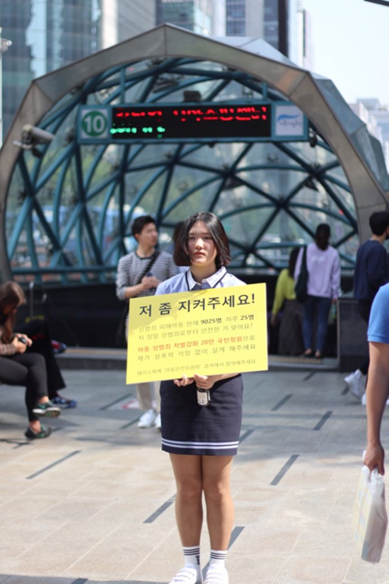 아동안전위원회는 페이스북 계정을 통해 경기 성남시의 한 고교 2학년에 재학 중인 학생의 1인 시위 영상을 공개했다. 영상 속 학생은 "저 좀 지켜주세요! 한해 9025명, 하루 25명 아동이 성범죄를 당하고 있다. 내일 나는 피해자가 되지 않을까 하는 두려움에 살고 있다. 그래서 아동 성범죄 처벌강화를 촉구하는 국민청원을 신청했다. 그런데 생각보다 많이 동의해 주시지 않는다"는 내용을 피켓에 담았다.
