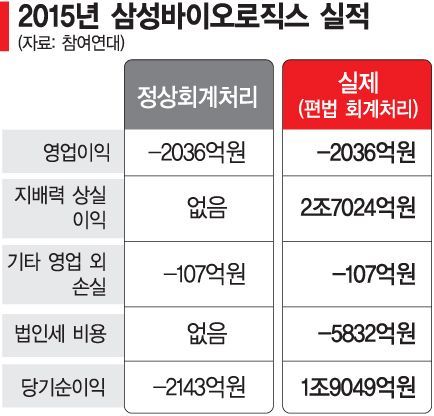삼성바이오로직스는 2014년까지 삼성바이오에피스를 종속회사로 판단했다. 그런데 2015년 삼성바이오에피스가 유럽에서 신약 승인을 받은 뒤 관계회사로 바꿨다. 국제회계기준에 따르면 종속회사가 관계회사로 전환될 경우 지분가치 평가를 장부가액이 아닌 시장가액으로 회계처리할 수 있다. 회계처리 방식을 바꾸면서 약 3000억원이던 삼성바이오에피스 지분가치는 단숨에 4조8000억원으로 16배 이상 부풀려졌다. 삼성바이오로직스가 2015년 흑자를 기록한 이유다. 만약 회계처리 변경이 없었다면 삼성바이오로직스는 당시 2100억원대의 적자를 냈을 것으로 참여연대는 추정했다.