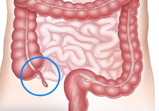맹장에 꼬리처럼 달려있는 충수(파란색 원). 유익한 박테리아 저장소인 것으로 밝혀졌습니다.[사진=유튜브 화면캡처]