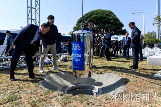 3일 인천공항공사 제2합동청사에서 열린 '인천공항 제2여객터미널 개장 100일 기념행사'에서 공항 관련 물품과 자료등이 담겨 있는 타임캡슐이 매설되고 있다./영종도=강진형 기자aymsdream@