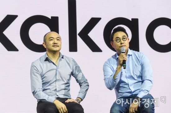 조수용(왼쪽) 카카오 공동대표와 여민수 카카오 공동대표가 27일 서울 중구 웨스틴조선호텔에서 열린 '카카오 3.0' 기자간담회에 참석해 취재진 질문에 답하고 있다./강진형 기자aymsdream@