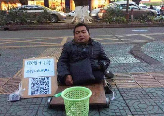현금 대신 모바일 결제가 일상화 된 중국에선 QR코드로 구걸하는 거지가 등장해 화제가 된 바 있다. 사진 = 중국 웨이보