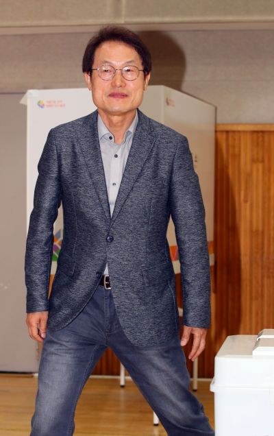 6·13전국동시지방선거 사전투표일인 8일 서울 종로구 교남동 주민센터에서 조희연 서울시 교육감 후보가 사전투표를 마친 뒤 미소짓고 있다. [이미지출처=연합뉴스]