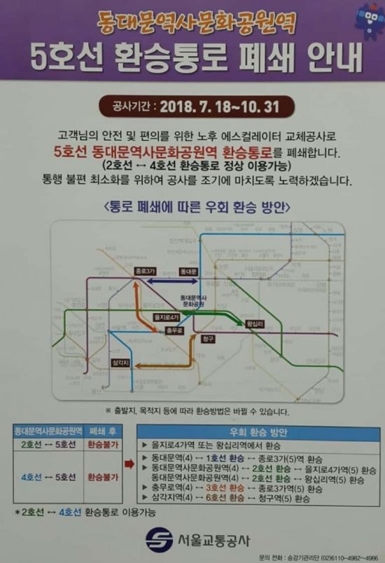 서울교통공사는 7월18일부터 10월31일까지 서울 지하철 동대문역사문화공원역 5호선 환승통로를 폐쇄한다고 11일 밝혔다. (사진=온라인 커뮤니티 캡처)