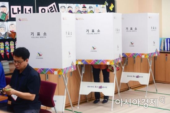 제7회 전국동시지방선거 및 국회의원 재·보궐선거일인 13일 서울 송파구 잠신초등학교에 마련된 투표소에서 시민들이 투표를 하고 있다. /문호남 기자 munonam@