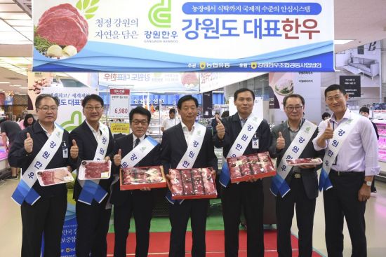 14일 서울 서초구 하나로마트 양재점에서 강원한우 김천일 대표이사(왼쪽에서 3번째)와 농협유통 경종혁 전무이사(왼쪽에서 5번째)가 참석한 가운데 ‘강원한우 특판전’이 개최됐다