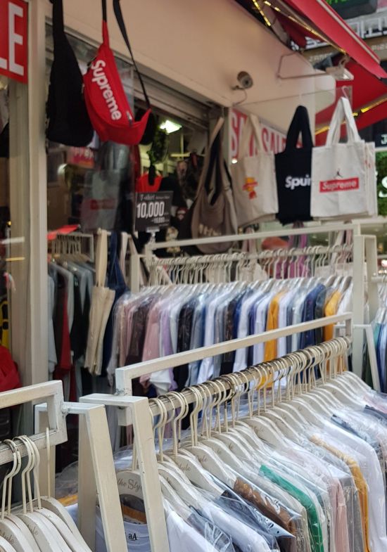 바로 옆 의류 판매대엔 최근 '힙하다'는 미국 스트리트 브랜드 슈프림 짝퉁제품들이 눈에 띄었다. 수 십개의 슈프림 티셔츠와 가방이 겹겹이 걸려 있었던 것. 인근을 둘러보니 아예 슈프림 제품만 파는 매장도 찾을 수 있었다. 매장마다 제품 가격은 제각각. 8000원에서 최대 4만원까지 다양했다. 슈프림만 취급하는 매장 직원은 길거리 제품들보다 재질이 더 좋아 가격이 상대적으로 비싸다고 했다.