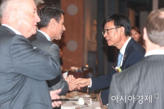 김상조(오른쪽) 공정거래위원회 위원장과 드미트리스 실라키스(왼쪽 두 번째) 주한유럽상공회의소 회장이 22일 서울 중구 하얏트호텔에서 열린 '주한유럽상공회의소 간담회'에 참석해 악수하고 있다./강진형 기자aymsdream@