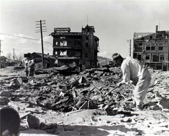 폐허가 된 원산(1950.11.8) = 한 남성이 폭격으로 잿더미가 된 자신의 집터에서 쓸만한 물건을 찾고 있다. 이곳은 원산 시내로, 원산은 공산군의 산업 중심지이자 주요 항구였기 때문에 폭격의 주요 목표였다.