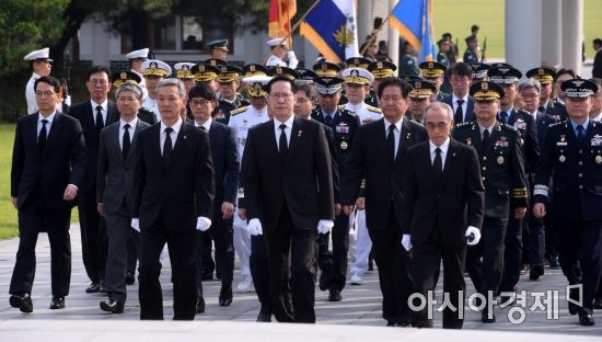 6.25전쟁 68주년인 25일 서울 동작구 국립서울현충원에서 송영무 국방부장관과 군 장성들이 현충탑을 참배하고 있다./사진=아시아경제
