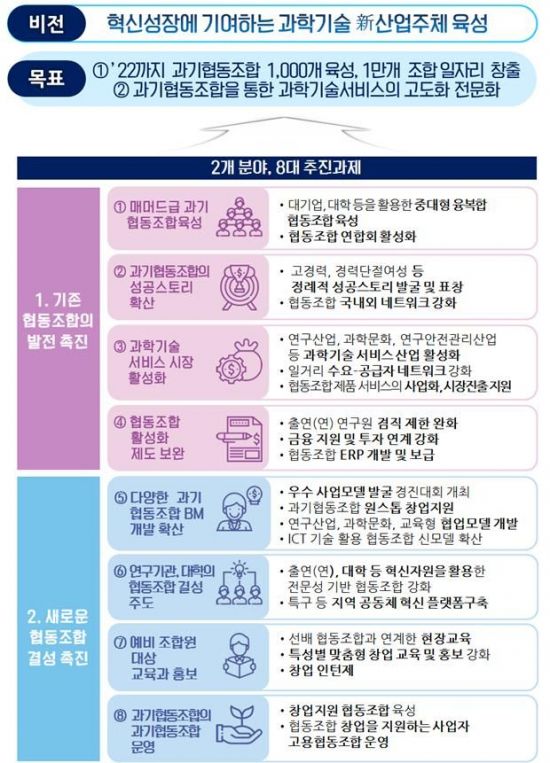 이번 전략은 2022년까지 과기협동조합 1000개를 육성하고 조합 일자리를 1만개를 창출하는 것을 목표로 하고 있다. 이를 위한 8대 추진과제도 수립됐다. ▲대학·대기업 등이 참여하는 매머드급 과기협동조합 육성 ▲연 10여개 우수사례 발굴·표창 등을 통해 과기협동조합 성공스토리 확산 ▲연구산업, 과학문화산업, 연구안전관리 산업 등 과학기술 서비스 시장 활성화 ▲과기협동조합 비즈니스 시장 형성 및 전문화 토대 마련 ▲원스톱 창업지원 등을 통한 다양한 협동조합 사업모델 개발·확산 ▲출연연구기관·대학 구성원의 협동조합 결성 적극 유인·지원 ▲예비 조합원에 대한 교육과 홍보 강화 ▲협동조합 확산 생태계 조성 등이다.